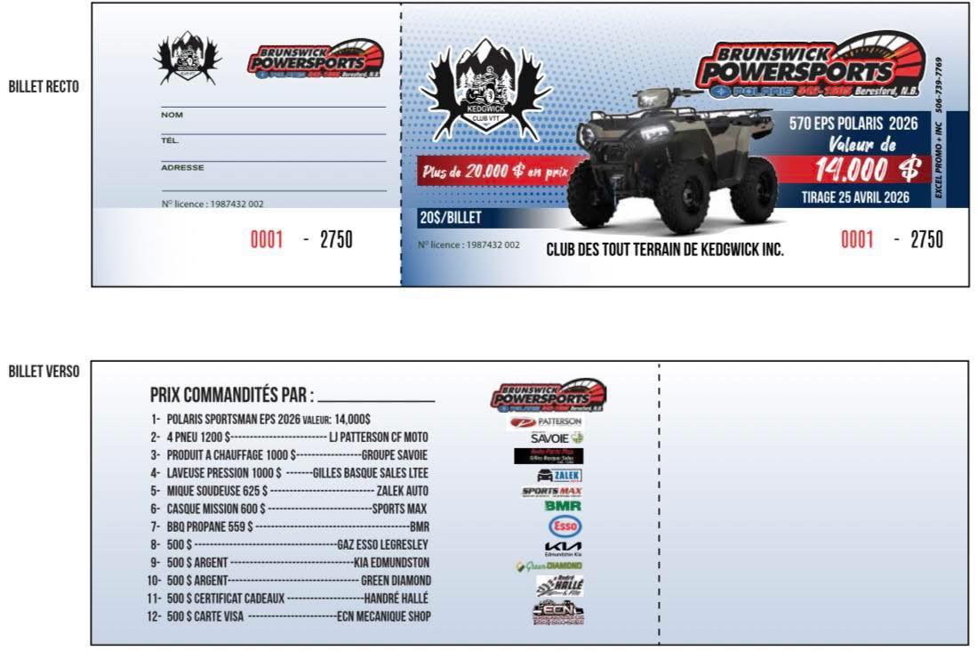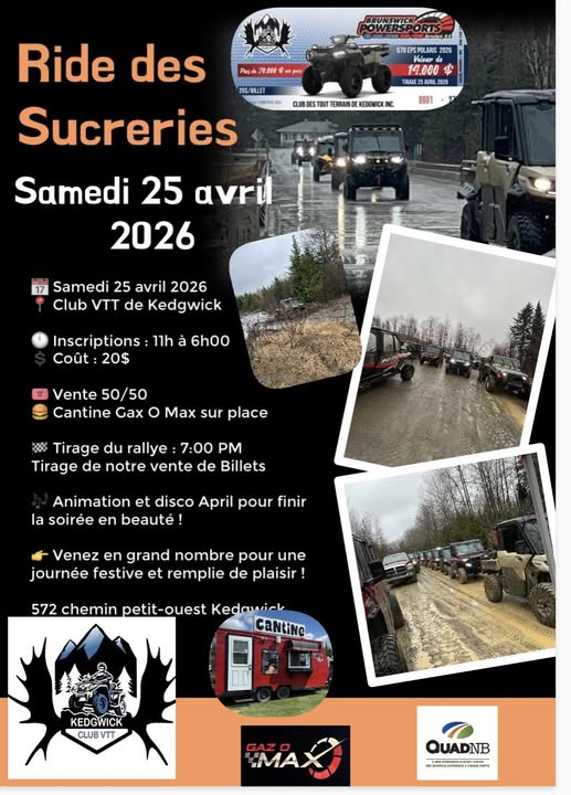 Le Club VTT Kedgwick (Club 2) organisera une randonnée des sucres le samedi 25 avril 2025, au départ du club, situé au 572, chemin Petit-Ouest à Kedgwick. L'inscription est à 11h, suivie de la randonnée. Tirage de prix à 19h. Musique/danse par la suite.