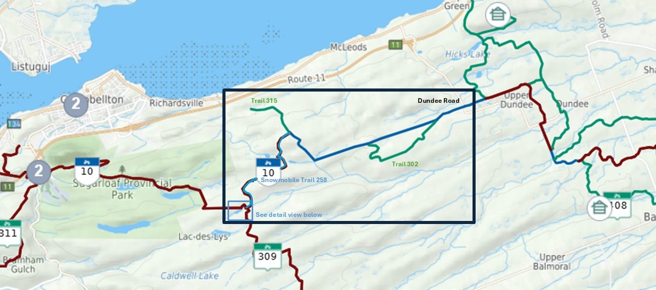 This new addition to the winter trail system is due to an agreement between VTT Restigouche, VTT 2000 and our good friends at the Restigouche Timber Trails Snowmobile Club.  The snowmobile club has agreed to allow shared access to trail #258 (ATV’s on the right, snowmobiles on the left), which provides a connection from the groomed trails of Thompson Road and VTT 2000 to Val-d’Amour via the Lac-Des-Lys Road.  See the images below.