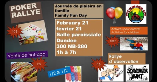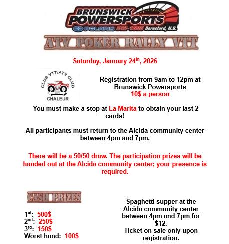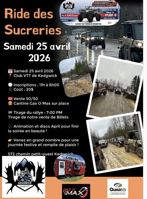 Club VTT Kedgwick (Club 2) will be hosting a Sugar Ride on Saturday, April 25, 2025 leaving from the Club at 572 Petit-Ouest Road in Kedgwick. Registration is at 11 am with ride to follow. Prize draw at 7 pm. Music/dance to follow.
