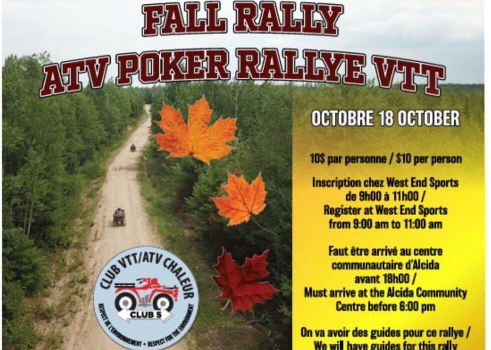 Club VTT Chaleur ATV Club will be hosting a Poker Rally on Saturday, October 18, 2025. Registration is from 9 am to 11 am. Bring your own lunch.